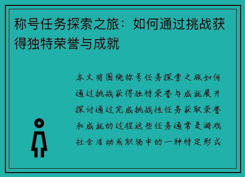 本文将围绕“称号任务探索之旅:如何通过挑战获得独特荣誉与成就”展开,探讨通过完成挑战性任务获取荣誉和成就的过程。这些任务通常是游戏、社会活动或职场中的一种特定形式,通过完成各种任务获得特定的称号,代表着个人在某一领域的卓越表现。文章从四个方面进行详细的阐述:一是称号任务的背景与意义;二是挑战任务的设计与执行;三是通过挑战获得的成就感;四是称号任务的社会与心理价值。通过这些探讨,本文旨在揭示挑战任务对个人成长、社会认同和心理满足的深远影响。